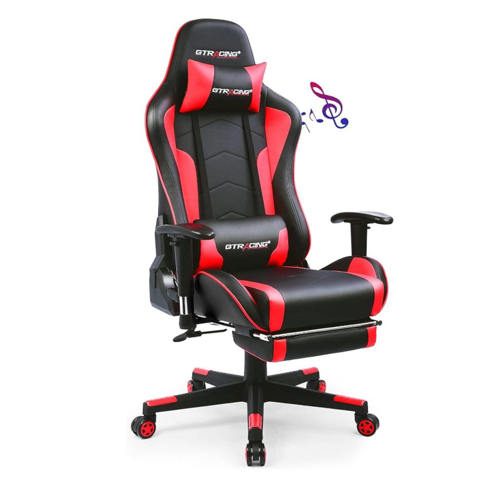 - Misc: adjustable armrests, height and tilt; lumbar support cushion and headrest cushion (removable); winged open back; 2 built-in Bluetooth speakers; retractable footrest